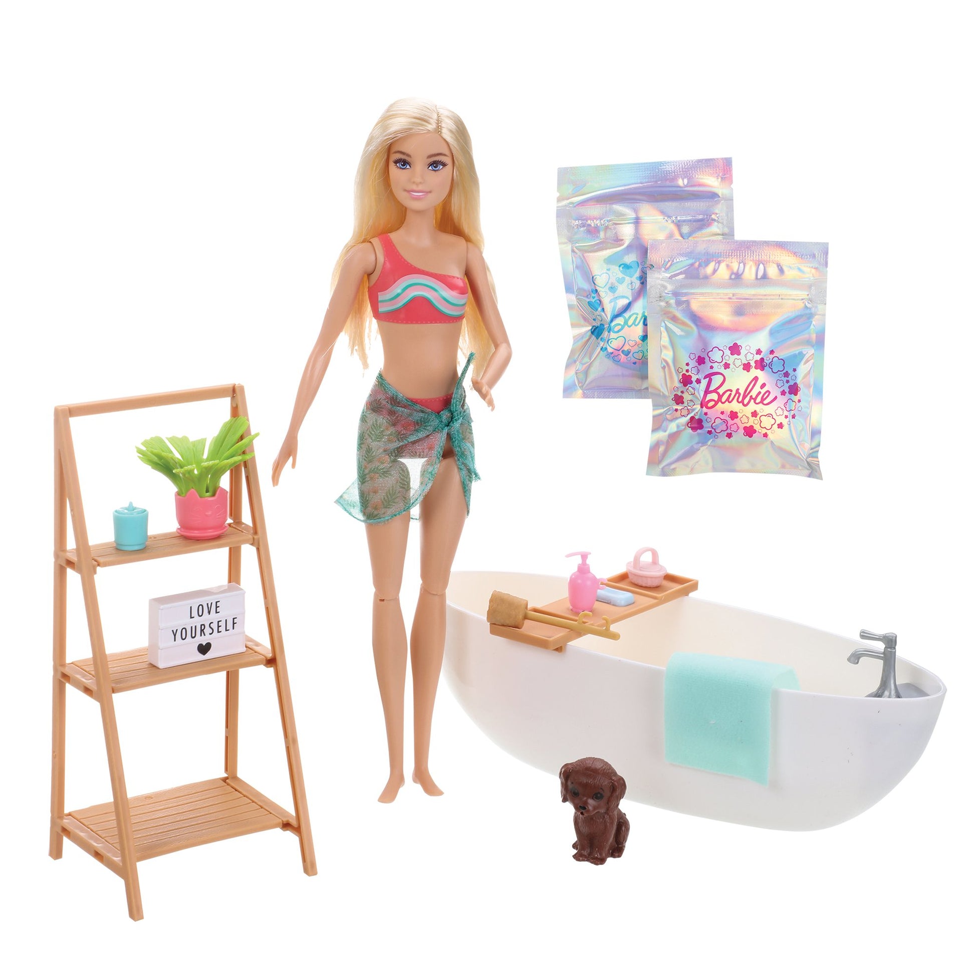 Ce coffret comprend une poupée Barbie en maillot de bain, un chiot, une baignoire, une étagère de spa, 5 sachets de poudre de bain moussante et pailletée et des accessoires sur le thème du bain. Pour recréer l'ambiance d'un vrai spa, remplissez la baignoire d'eau, installez-y la poupée et versez le contenu de l'un des sachets de poudre moussante pailletée : l'eau change alors de couleur, fait des bulles et crée une belle mousse !